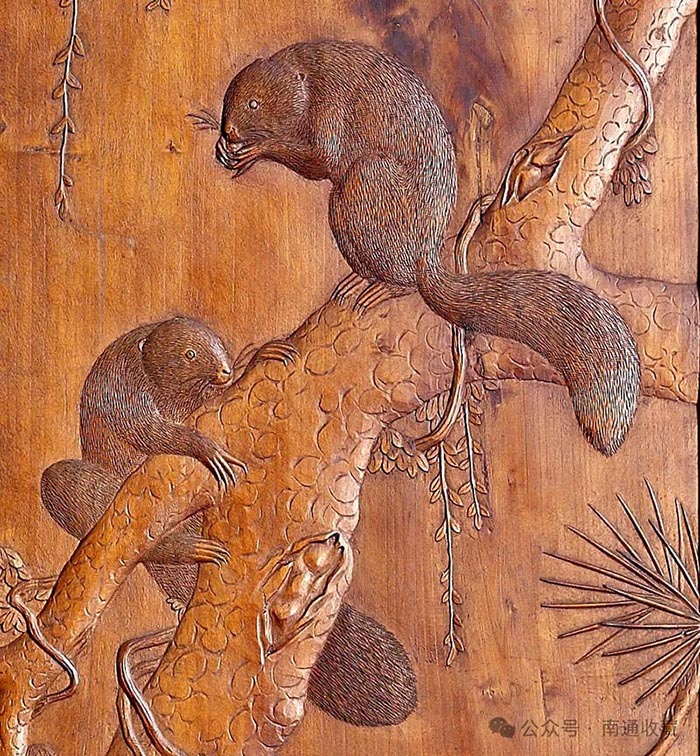 作為生肖之首的鼠是智慧的象征,然而其貌不揚的外形,也考驗著繪畫者的智慧。千百年來,人們賦予了它無限的想象,許多藝術效果讓人意外驚喜不斷。比如,張謇先生“濠陽小筑”主樓曼壽堂的十二生肖雕刻屏,將松鼠巧妙的運用其間,不得不讓人稱絕。松鼠是人們喜聞樂見的動物,那可愛機靈的形象常常出現在藝術作品之中,這里將此表現得更是惟妙惟肖,畫面中的兩只松鼠,一只呈攀戲狀,一只則坐于松樹干上啃食松果,兩條大大的尾巴雕刻得絲絲入微,給人以強烈的絨毛感。